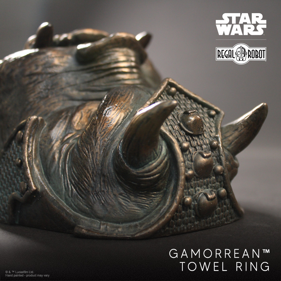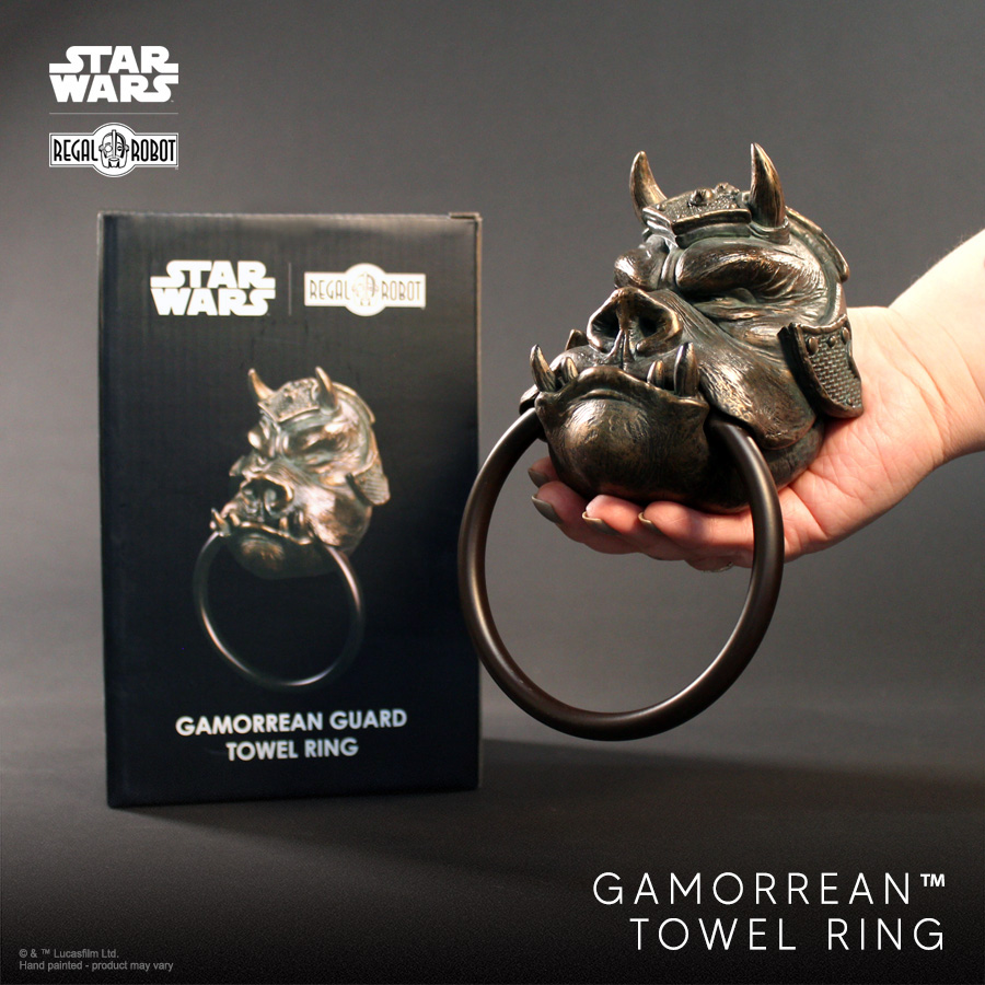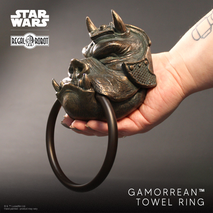 Regal Robot vient de dévoiler un nouvel accessoire de décoration inspiré de l’univers Star Wars : le Gamorrean Guard Towel Ring,  nous vous ne revez pas il s’agit bien d’un porte-serviette directement inspiré des gardes gamorréens qui protègent le palais de Jabba dans Le Retour du Jedi.