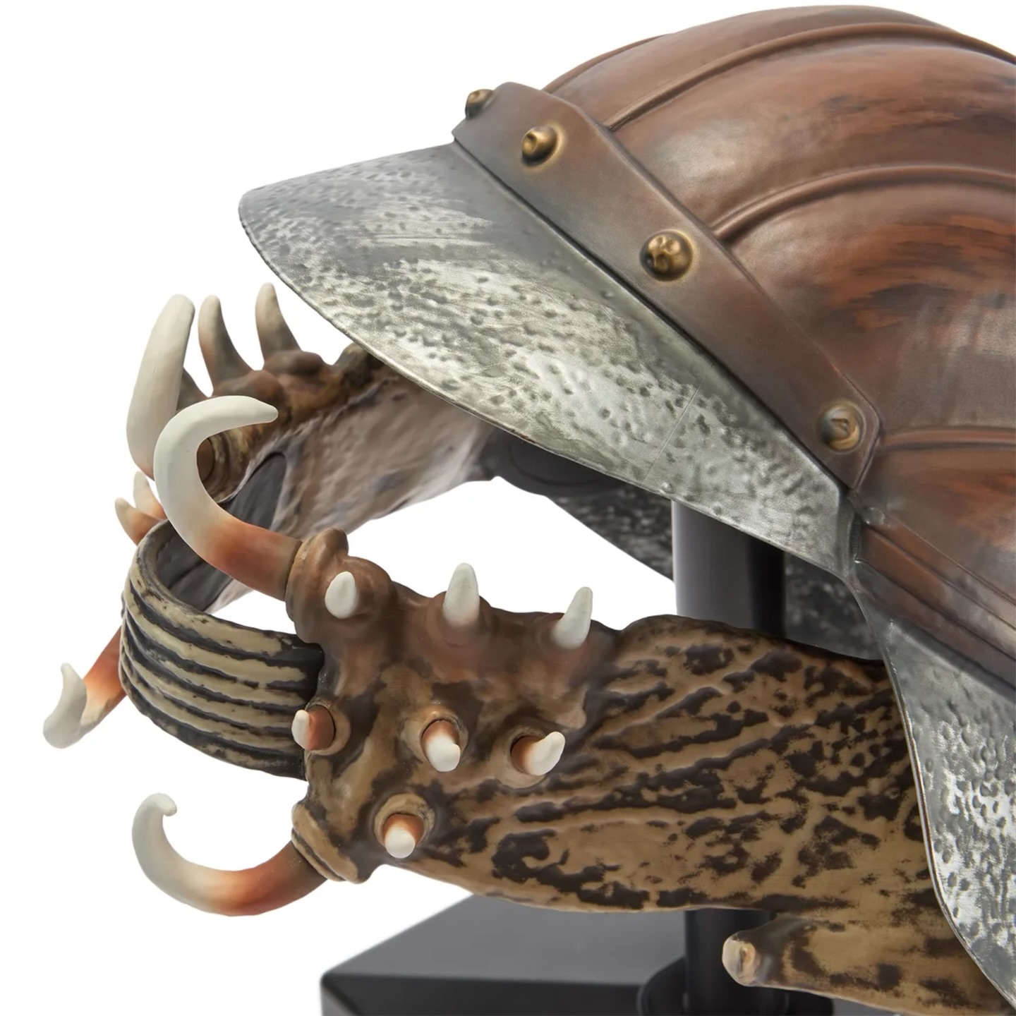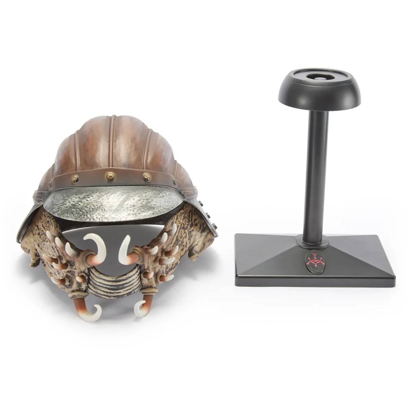 Doté d’une mâchoire articulée, il ne se contente pas d’être une pièce d’exposition : il peut aussi être porté, idéal pour le cosplay ou les conventions. Le casque est également livré avec un socle d’exposition, parfait pour les collectionneurs.