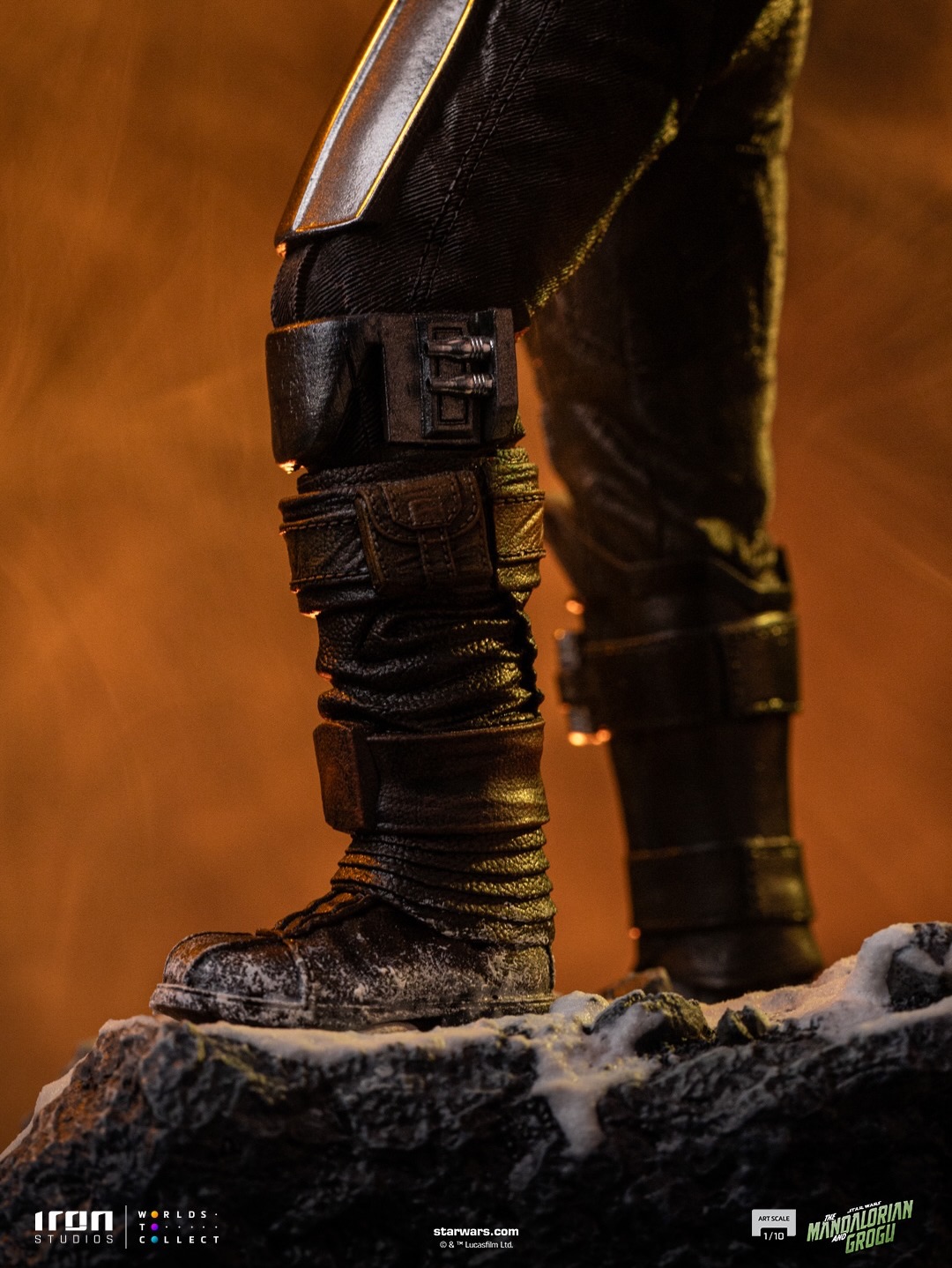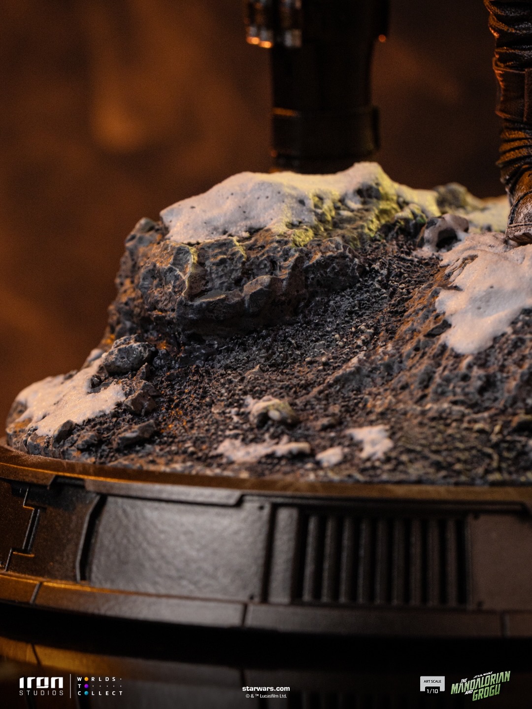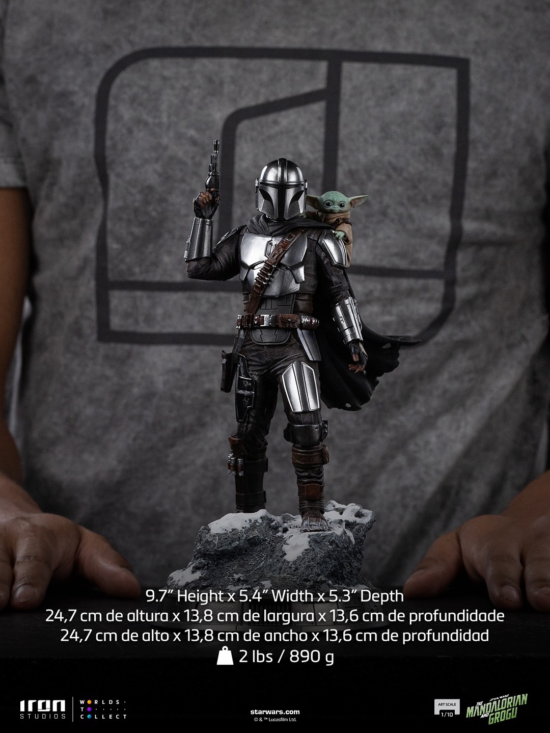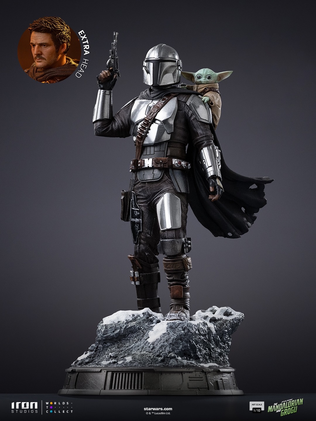Le chasseur de primes est sur un socle enneigé, blaster à la main et Grogu sur son épaule.